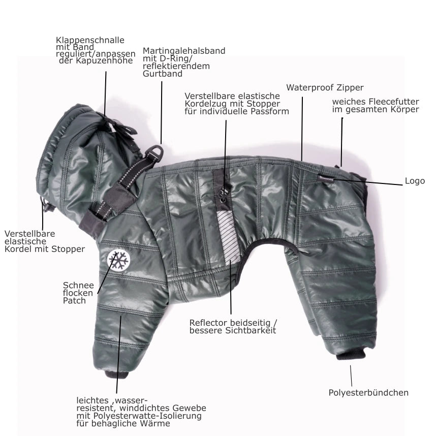 Der Cozy Cloud Wintersuit bietet Ihrem Italienischen Windspiel optimalen Schutz in der kalten Jahreszeit. Der handgefertigte Overall in Grün/Schwarz kombiniert gesteppte Wattierung für intensive Wärmeisolation mit windabweisendem und wasserresistentem Außenmaterial. Das weiche Floor-Fleecefutter in Schwarz sorgt für maximalen Tragekomfort und schmiegt sich angenehm an die zierliche Statur dieser sensiblen Rasse an. Jedes Stück wird in der Manufaktur mit Liebe zum Detail verarbeitet – für einen perfekten Sitz und langlebige Qualität, die Ihren Vierbeiner zuverlässig durch Frost und Nässe begleitet.