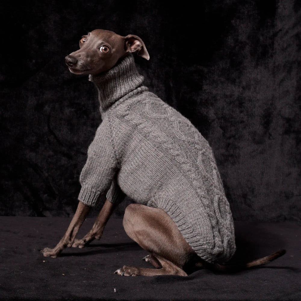 Verwöhnen Sie Ihr Italienisches Windspiel mit unserem handgestrickten Hundepullover "Luca" aus 100 % hochwertiger Merinowolle. Speziell auf die schlanke Anatomie dieser Rasse zugeschnitten, bietet der Pullover optimale Wärme und Atmungsaktivität. Das elegante Zopfmuster vereint Funktionalität mit stilvoller Ästhetik, während die weiche, langlebige Merinowolle Komfort und Schutz an kühlen Tagen garantiert. Ideal für Spaziergänge oder entspannte Stunden zuhause – ein eleganter Begleiter, der Komfort und Design perfekt verbindet.