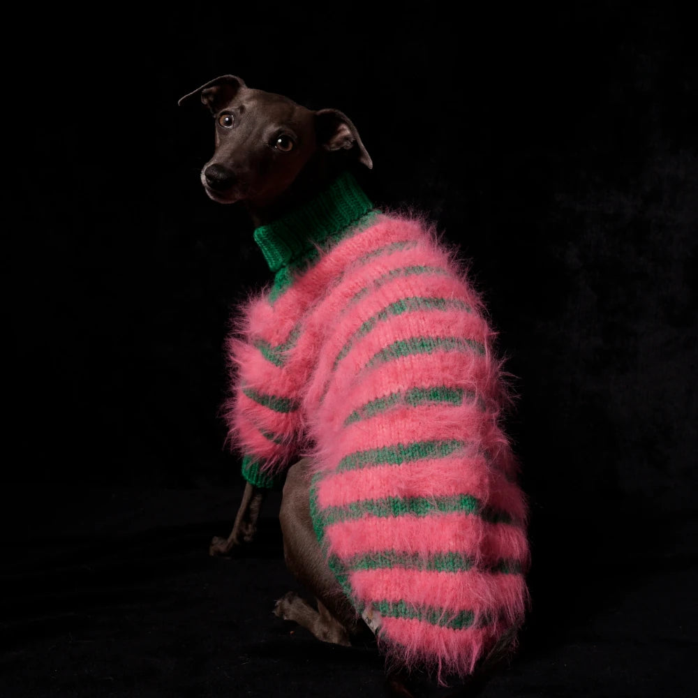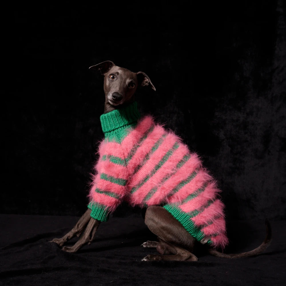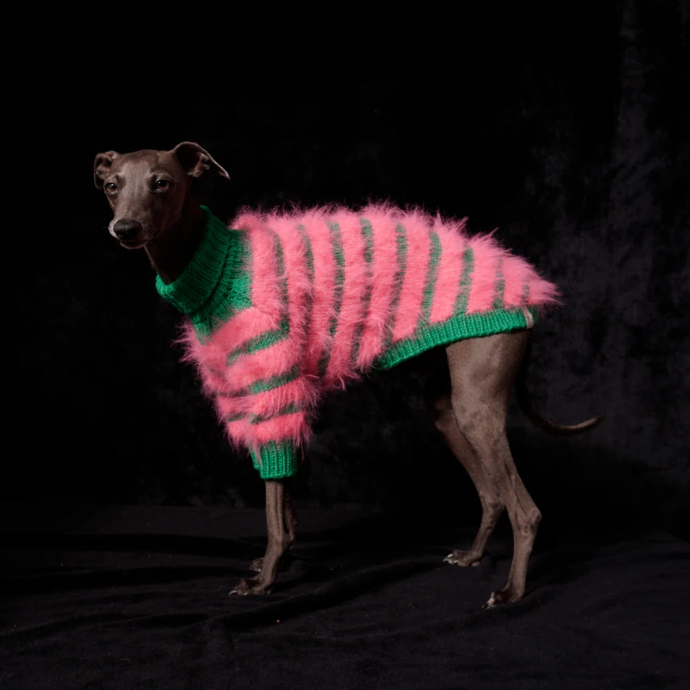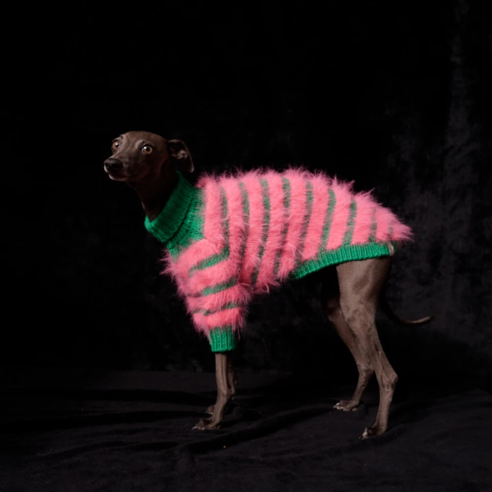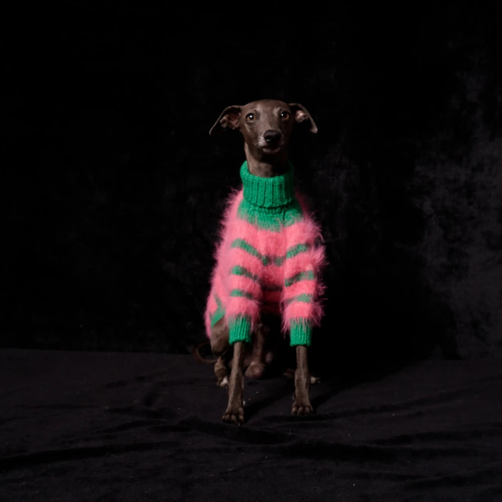 Der handgestrickte Hundepullover "June" verbindet exklusive Handwerkskunst mit elegantem Design, perfekt abgestimmt auf Italian Greyhounds. Aus erstklassigen Garnen nahtlos gefertigt, beeindruckt er mit einem extra langen pinker Flor und leuchtendem Grün, der außergewöhnlichen Tragekomfort bietet. Der Rollkragen und die dreiviertel Ärmel verleihen dem Pullover eine schlichte, edle Note. Als limitiertes Einzelstück erfüllt dieses luxuriöse Accessoire höchste Anforderungen an Qualität und Stil und ist ideal für anspruchsvolle Hundebesitzer, die Wert auf Individualität legen.