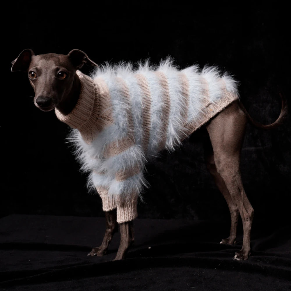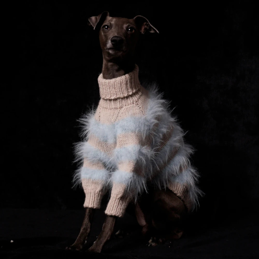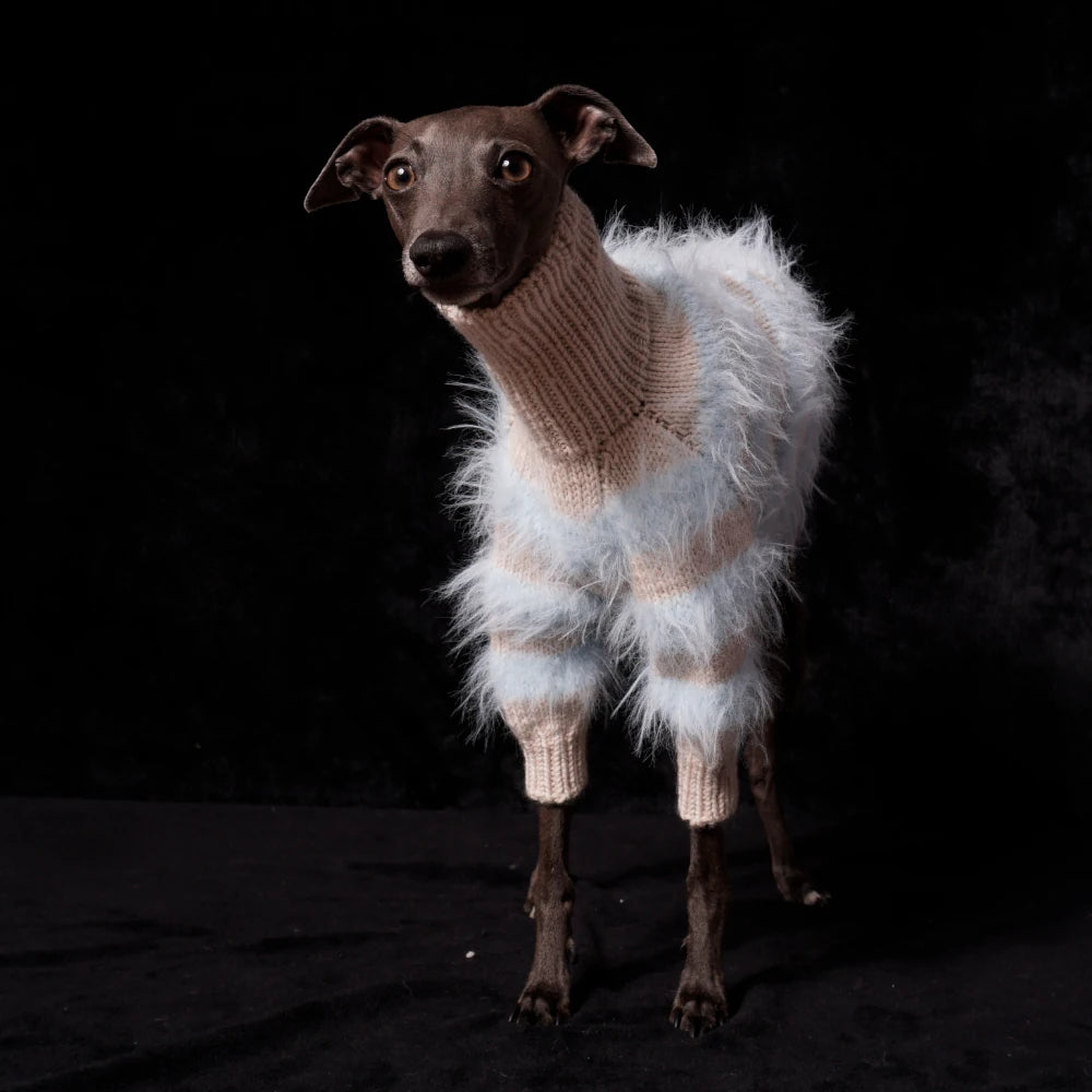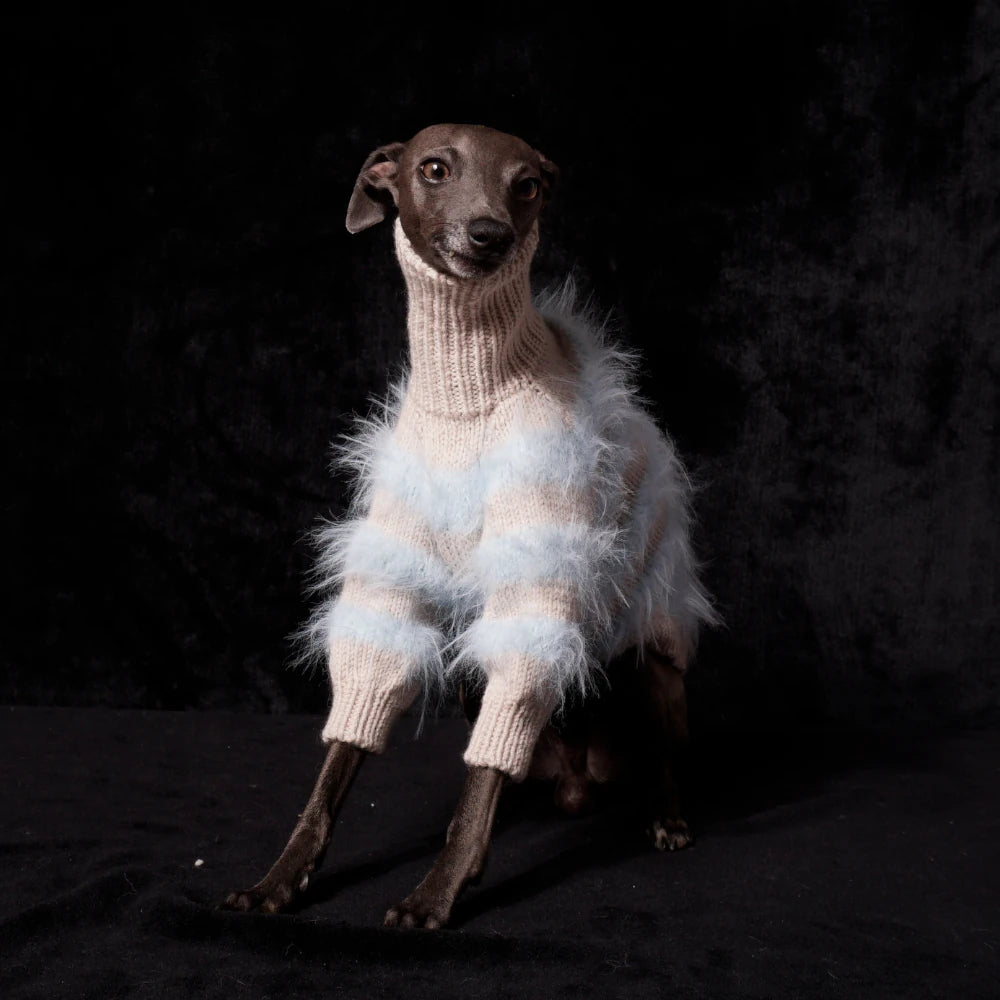 Der handgestrickte Hundepullover "Lion" vereint exklusive Handwerkskunst mit edlem Design speziell für Italian Greyhounds. Aus hochwertigsten Garnen gefertigt und nahtlos gestrickt, bietet er dank extra langem hellblauem Plüschflor im eleganten Beigeton ein außergewöhnliches Tragegefühl. Der Rollkragen und die dreiviertel Ärmel unterstreichen die puristische Eleganz dieses limitierten Luxusstücks, das als Einzelanfertigung höchste Ansprüche an Qualität und Stil erfüllt. Ein einzigartiges Accessoire für anspruchsvolle Hundebesitzer.