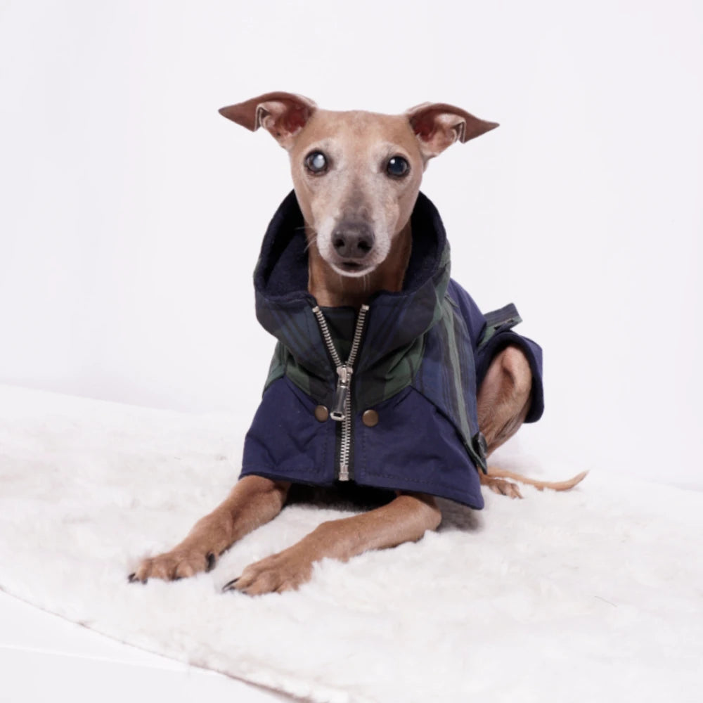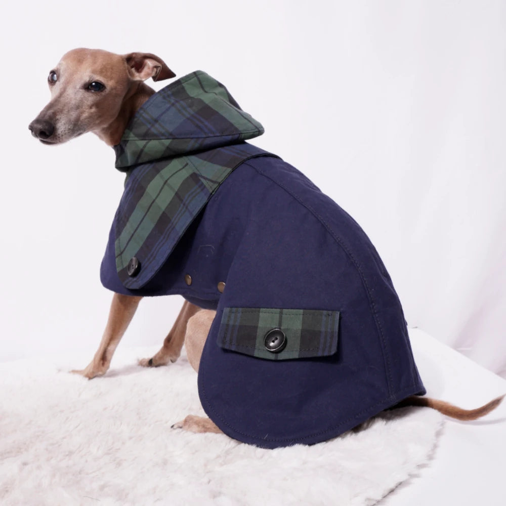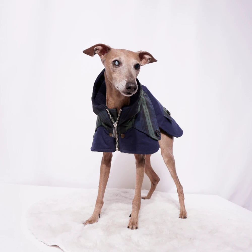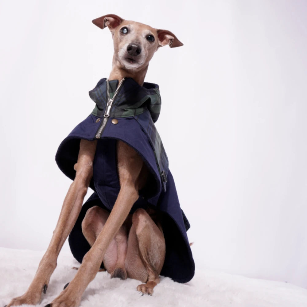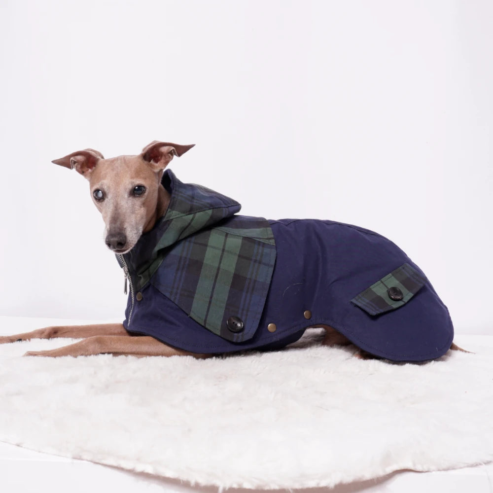 Der Ölskin Dry Mantel "Wilhelm" kombiniert strapazierfähigen, wasserabweisenden Oilskin Dry Stoff mit atmungsaktiver Funktionalität, ideal für italienische Windspiele. Das wärmende Merinowalk-Futter sorgt für Komfort bei kühlem Wetter. Das abgesetzte Rückenteil im Tartanmuster mit Knöpfen sowie dekorative Taschen betonen das durchdachte Design. Die Kapuze bietet zusätzlichen Schutz, während der verstellbare und ausknöpfbare Brustlatz mit Druckknöpfen Flexibilität für unterschiedliche Tragebedingungen gewährleistet. Ein Reißverschluss komplettiert den Mantel und macht ihn zum verlässlichen Begleiter bei wechselhaftem Wetter und aktiven Einsätzen.