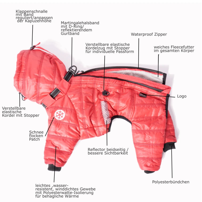 Der Cozy Cloud Wintersuit bietet Ihrem Italienischen Windspiel optimalen Schutz in der kalten Jahreszeit. Der handgefertigte Overall in leuchtendem Rot kombiniert gesteppte Wattierung für intensive Wärmeisolation mit windabweisendem und wasserresistentem Außenmaterial. Das weiche Fleecefutter in Graubeige sorgt für maximalen Tragekomfort und schmiegt sich angenehm an die zierliche Statur dieser sensiblen Rasse an. Jedes Stück wird in der Manufaktur mit Liebe zum Detail verarbeitet – für einen perfekten Sitz und langlebige Qualität, die Ihren Vierbeiner zuverlässig durch Frost und Nässe begleitet.