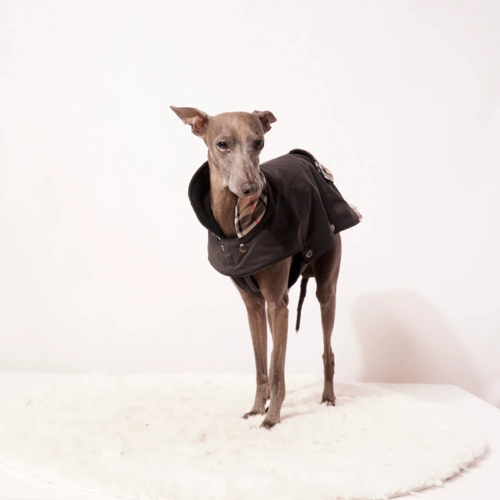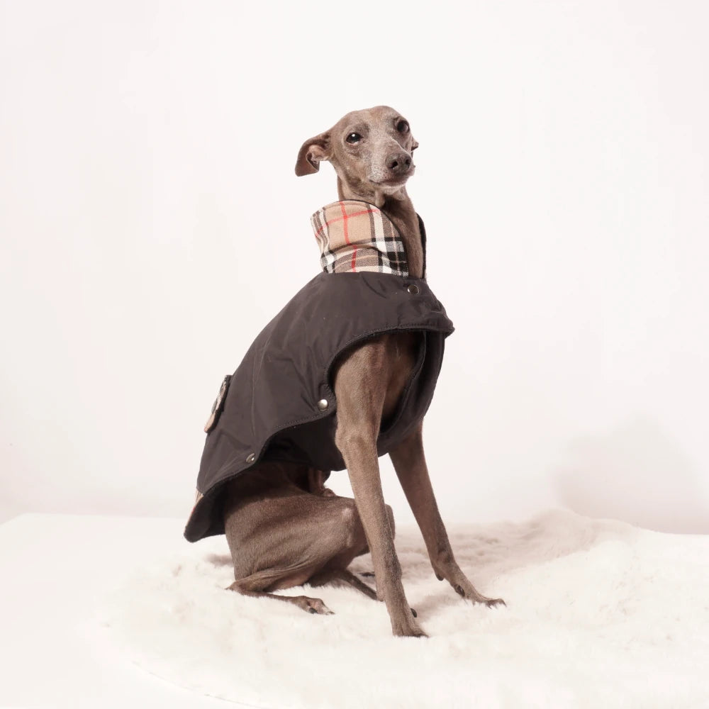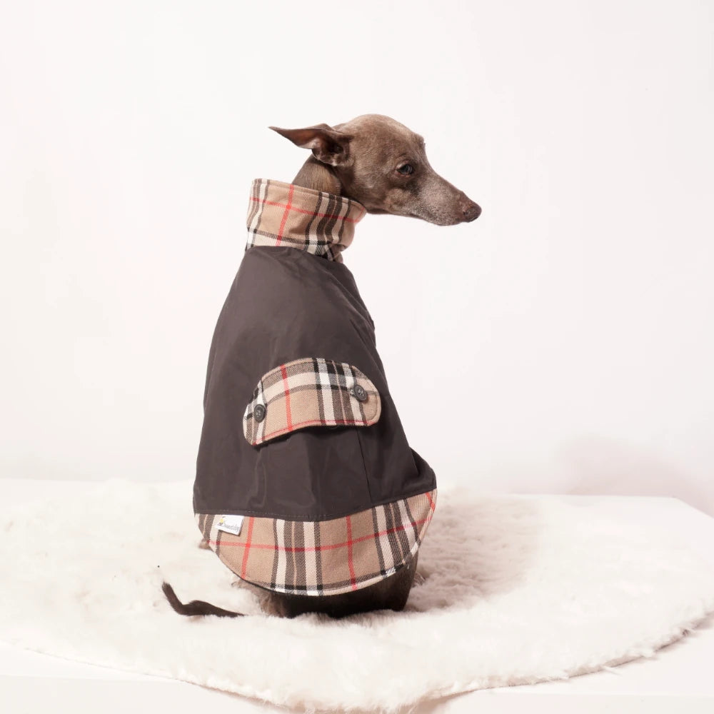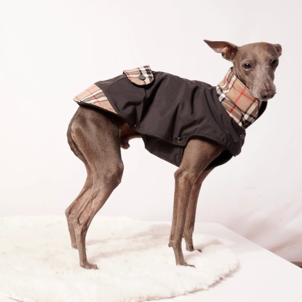 Die limitierte Weste "SYDNEY" ist ideal für italienische Windspiele und Chinesische Schopfhunde. Sie besteht aus einem wasserabweisenden, winddichten und atmungsaktiven Außenmaterial, das hohen Schutz bei wechselhaftem Wetter bietet. Das innenliegende Polyester-Merinofutter sorgt für eine angenehme Wärmeisolierung und Hautfreundlichkeit. Der knöpfbare, wasserabweisende Bauchlatz ermöglicht eine einfache Reinigung und zusätzlichen Schutz. Mit einem edlen Anthrazit-Tartan-Design, Stehkragen und verschließbaren Druckknöpfen vereint die Weste Funktionalität und stilvolle Optik – auch in Kombination mit einem Jumpsuit ein Blickfang.