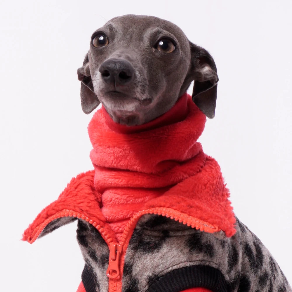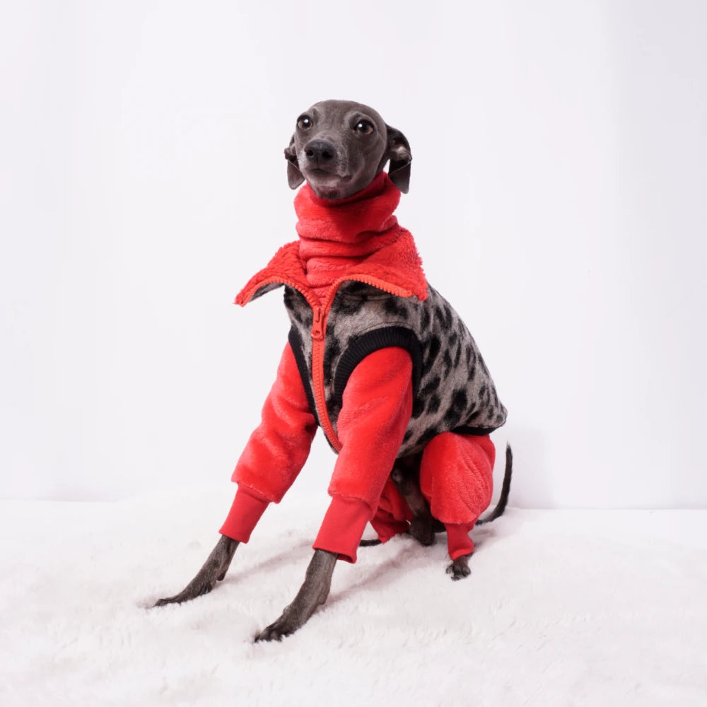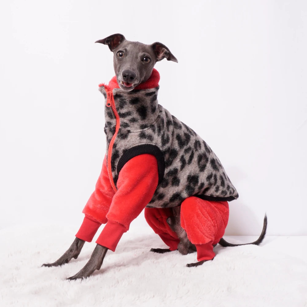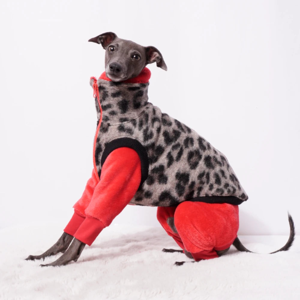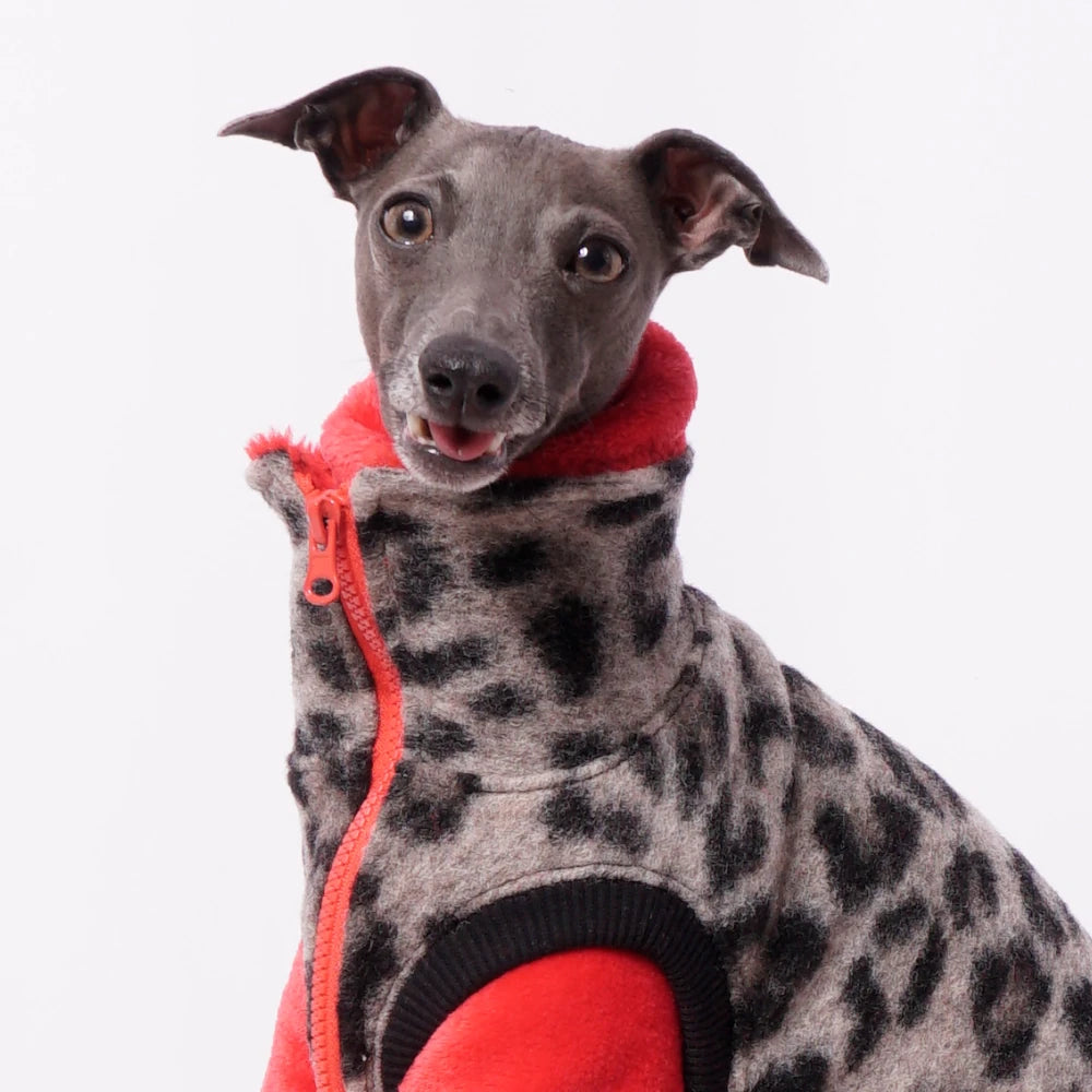 Die limitierte Edition der Leopardenweste "LEO" verbindet wärmendes Teddyfutter aus technischer Faser mit 20 % Wolle in einer dehnbaren Maschenbindung und einem Obermaterial aus 65 % Wolle sowie 35 % Polyacryl. Diese Materialkombination garantiert hohen Tragekomfort und verlässlichen Wärmeschutz für jedes Windspiel. Stehkragen und robuster Reißverschluss erleichtern das Anziehen und schützen zusätzlich vor Kälte. Elastische Abschlüsse an Saum und Achseln sorgen für eine perfekte Passform. Die vielseitige Weste eignet sich ideal sowohl für sich allein als auch über einem Overall, etwa dem Modell Katleen
