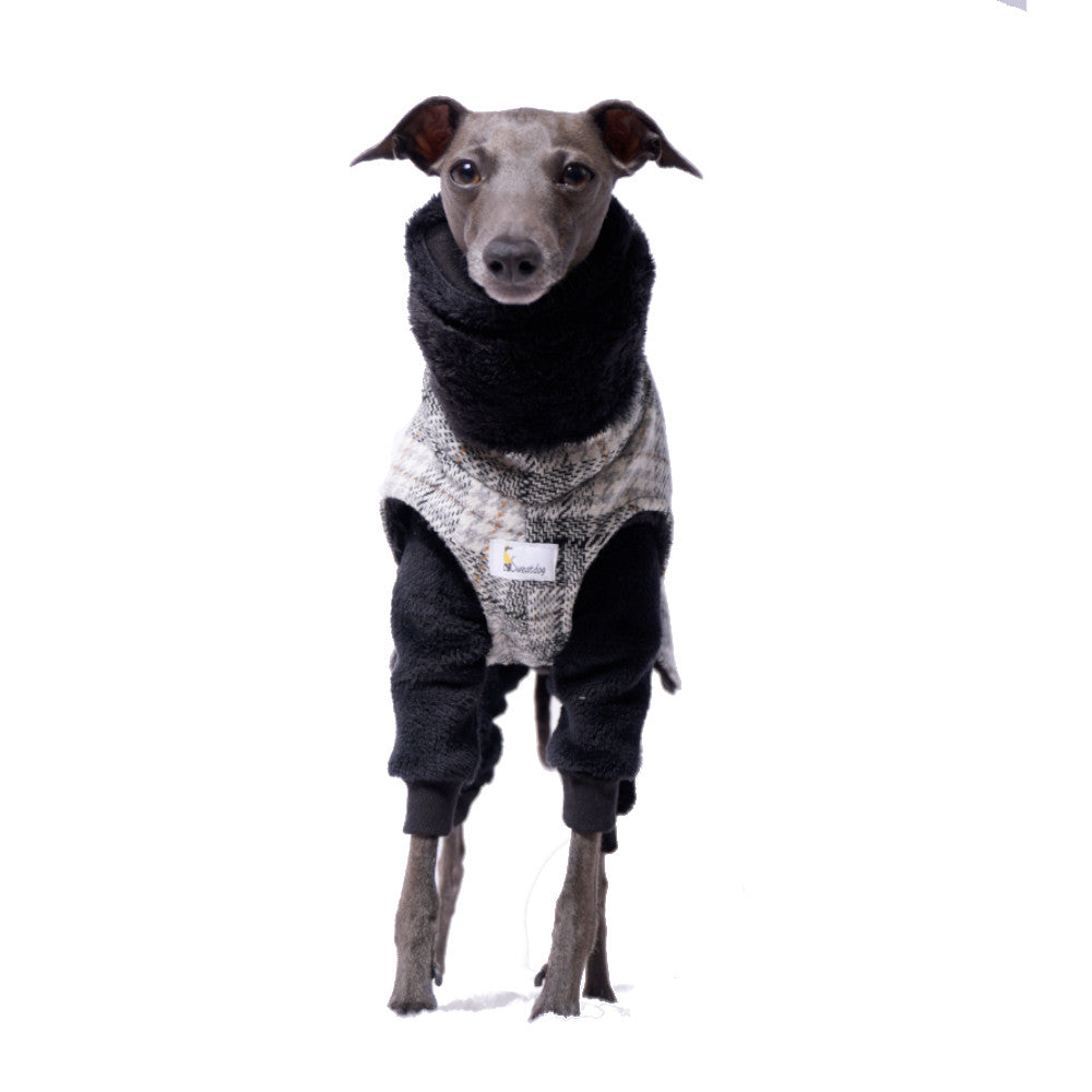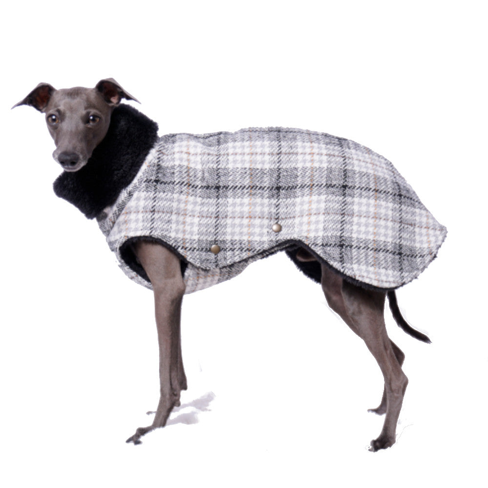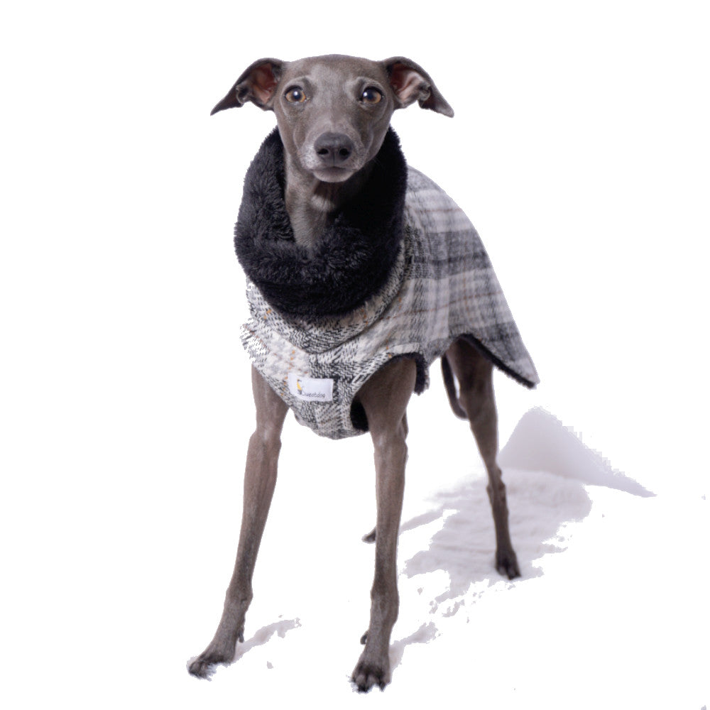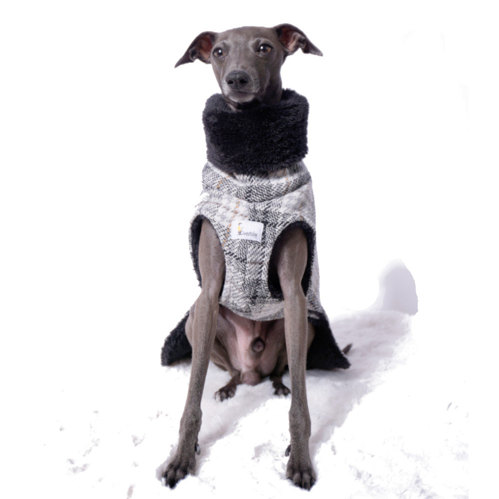 Der Mantel „COCO“ verbindet klassischen Hahnentritt-Look mit einem modernen Schnitt, speziell entwickelt für italienische Windspiele. Die elegante Silhouette wird durch einen geraden, hohen Stehkragen und einen Brustlatz mit praktischen Druckknöpfen ergänzt. Das schwarze Plüschfutter sorgt für Wärme und komfortablen Sitz, was insbesondere bei kühleren Temperaturen Vorteile bietet. Dieses Modell vereint anspruchsvolles Design mit Funktionalität und schützt Ihr Tier stilvoll vor Kälte.