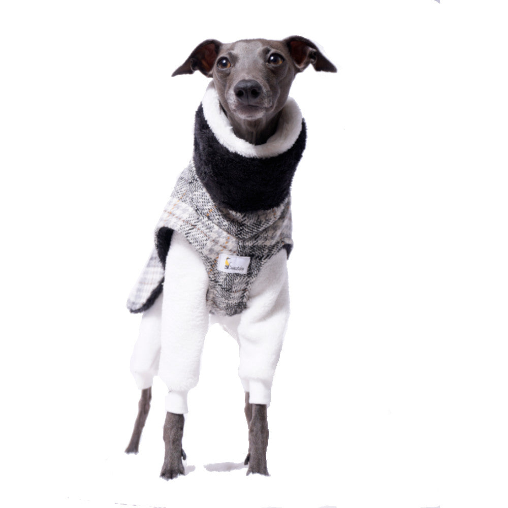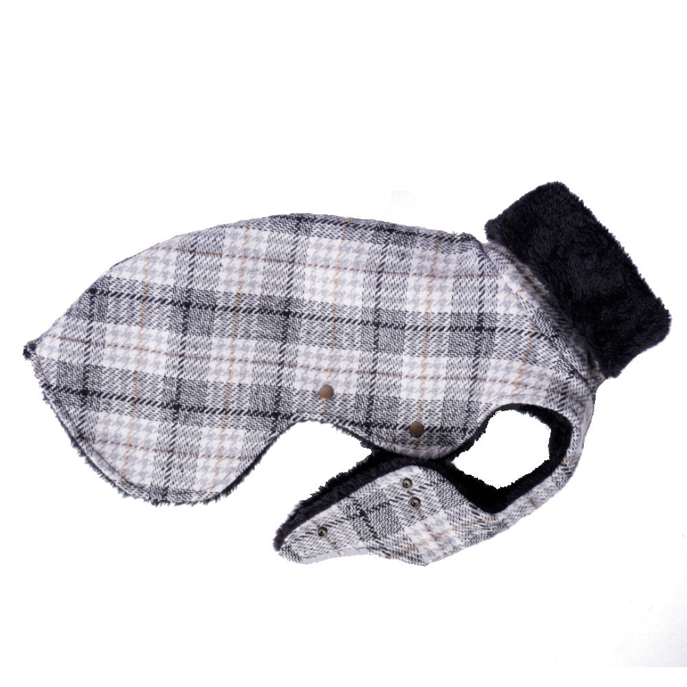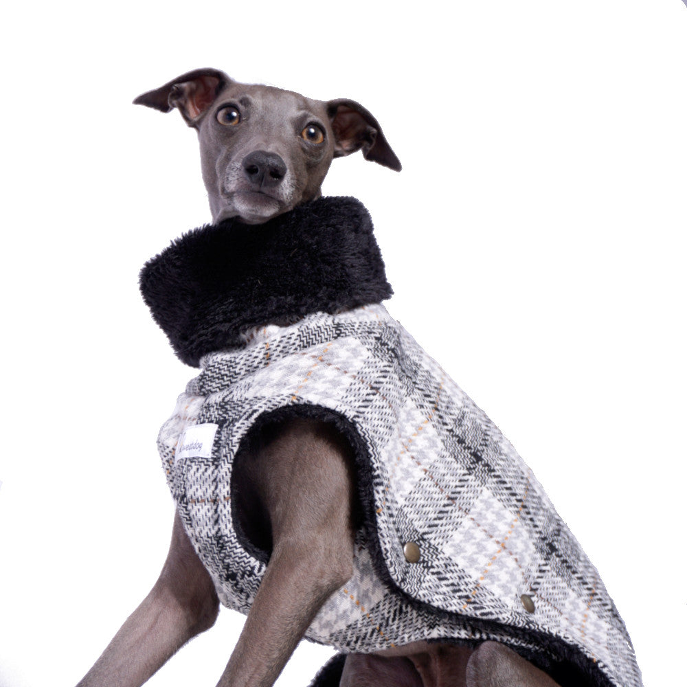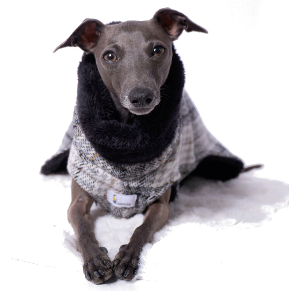 Der Mantel „COCO“ verbindet klassischen Hahnentritt-Look mit einem modernen Schnitt, speziell entwickelt für italienische Windspiele. Die elegante Silhouette wird durch einen geraden, hohen Stehkragen und einen Brustlatz mit praktischen Druckknöpfen ergänzt. Das schwarze Plüschfutter sorgt für Wärme und komfortablen Sitz, was insbesondere bei kühleren Temperaturen Vorteile bietet. Dieses Modell vereint anspruchsvolles Design mit Funktionalität und schützt Ihr Tier stilvoll vor Kälte.