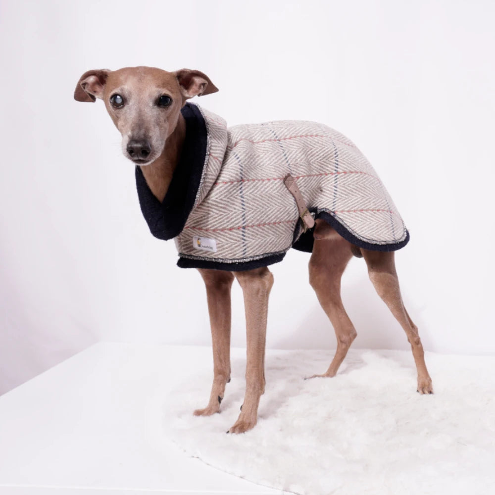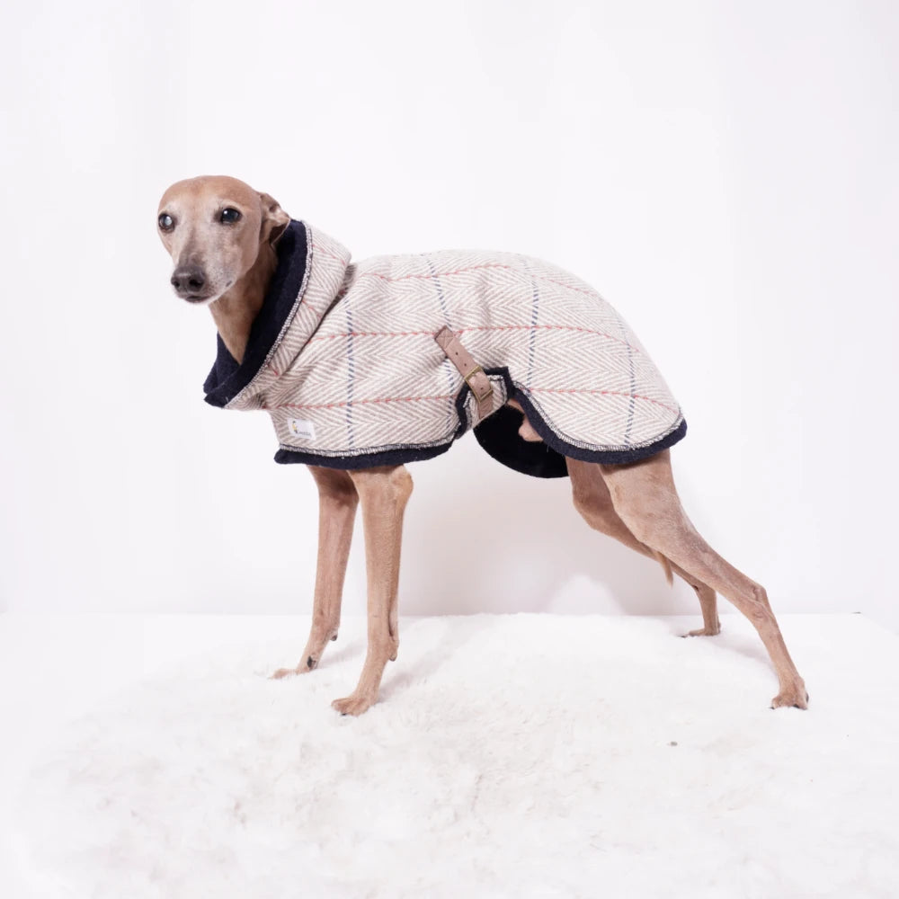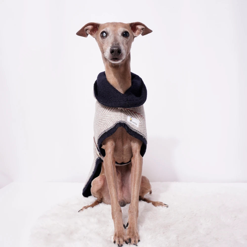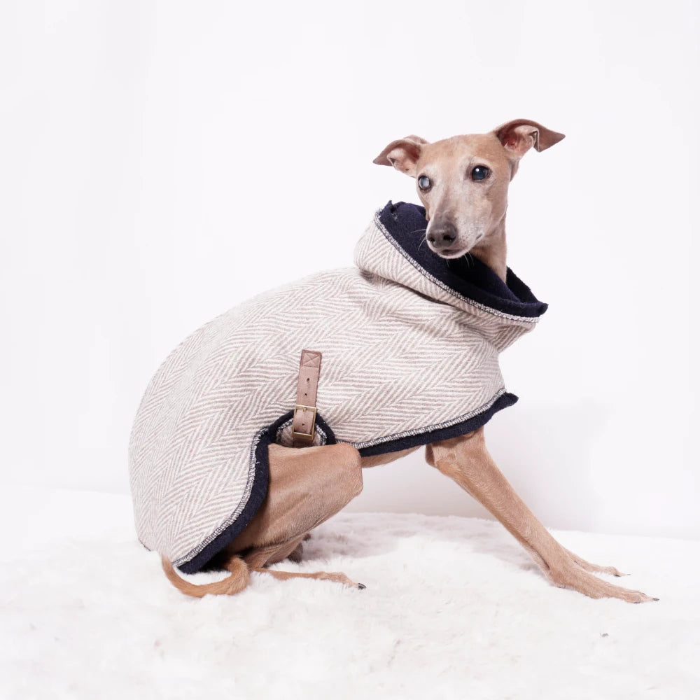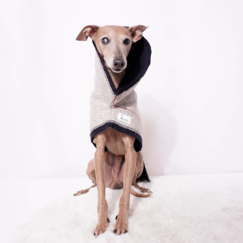 Der Mantel "Victoria" ist ein eleganter Doubleface-Wollmantel, der italienischen Windspielen mit seinem exklusiven Fischgrätdesign einen modernen und ausdrucksstarken Look verleiht. Das innenliegende Wollwalk-Futter sorgt für angenehme Wärme an kalten Tagen. Verschlossen wird der Mantel mit einem praktischen Riegel samt Schnallen, der eine sichere Passform garantiert. Der Kapuzenkragen schützt Hals und Kopf, während die Leinenöffnung im Nackenbereich bequemes Anleinen ermöglicht – ideal für stilbewusste Hundehalter, die Funktion und Design vereinen möchten.